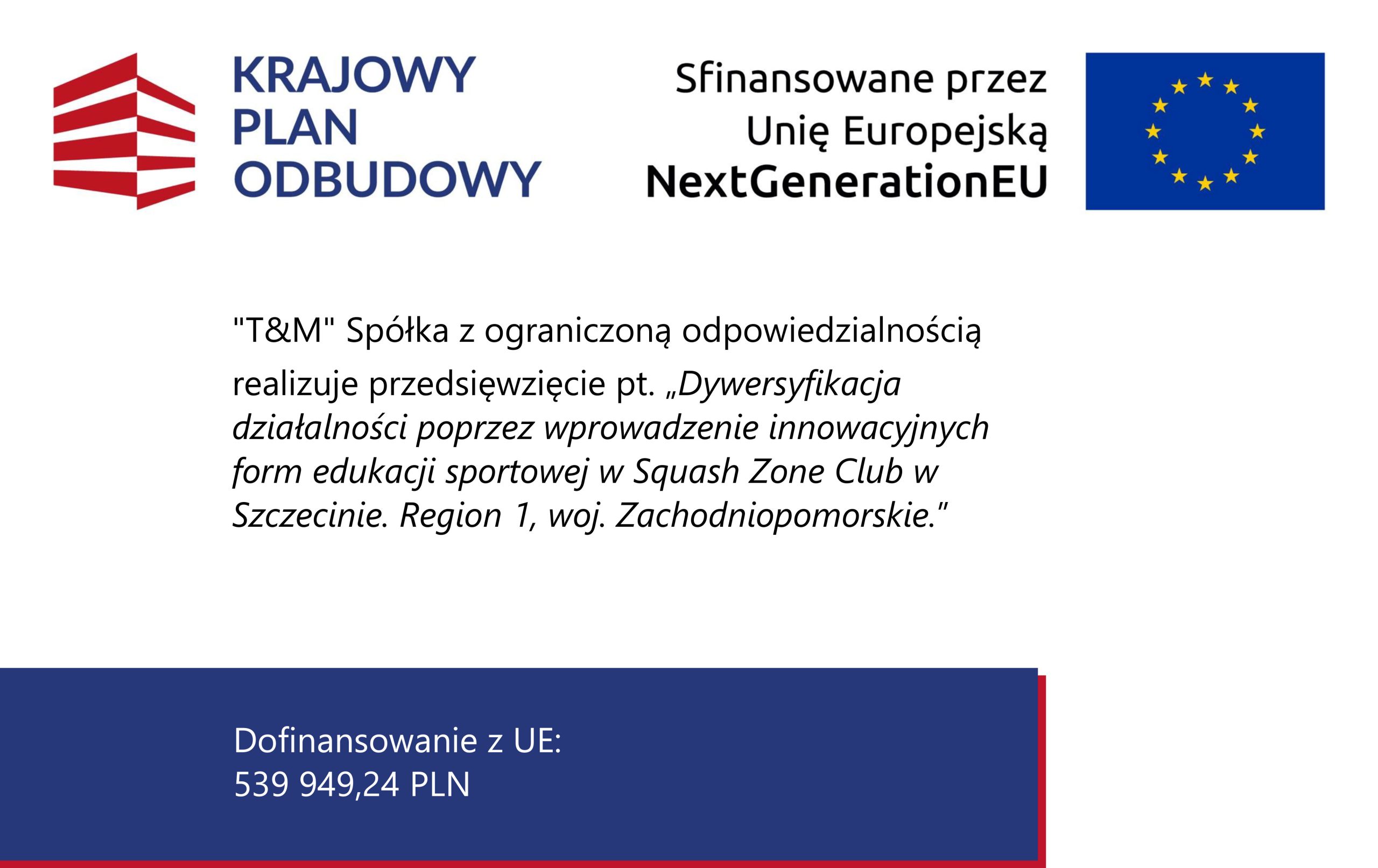 realizuje projekt dofinansowany z Krajowego Planu Odbudowy i Zwiększania Odporności (KPO) pt. „Dywersyfikacja działalności poprzez wprowadzenie innowacyjnych form edukacji sportowej w Squash Zone Club w Szczecinie. Region 1, woj. zachodniopomorskie.”